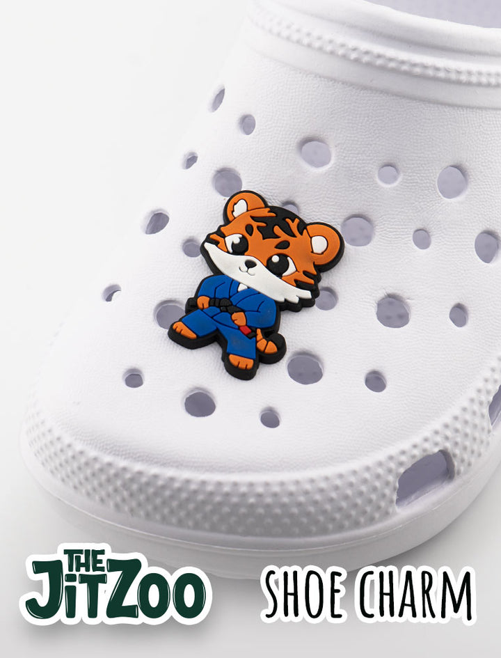 This fierce little grappler adds a bold touch to your footwear with its vibrant stripes and ready-to-roll pose. Whether you're heading to class or hitting the mats, this charm clips on easily and stays secure through every step. Perfect for young Jiu-Jitsu fans who love to walk with confidence and show off their wild side—one stride at a time!